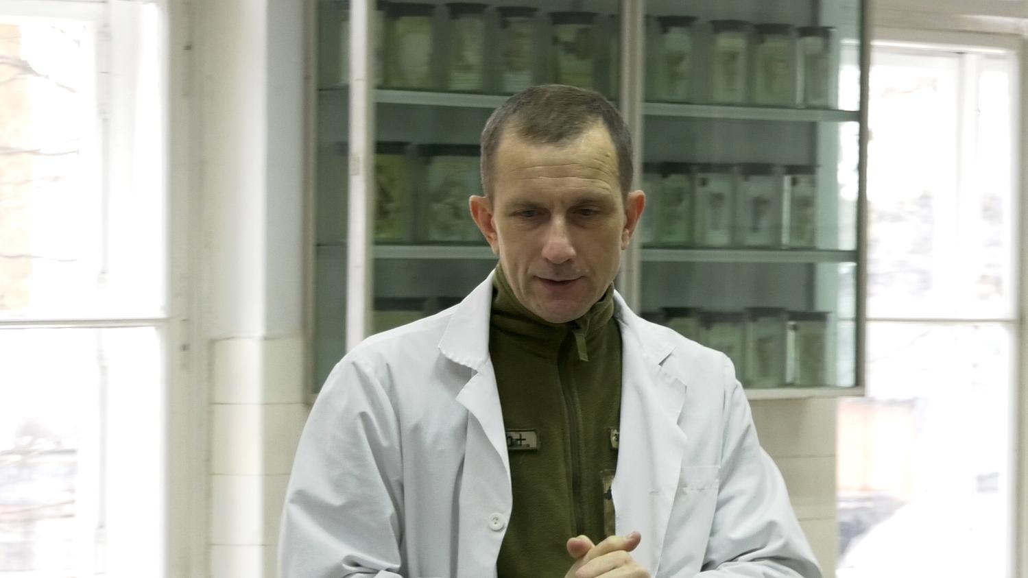 Сьогодні доцент кафедри нормальної анатомії ЛНМУ ім. Данила Галицького Максим Логаш проводить заняття у студентів-першокурсників. Та під білим халатом в нього військова форма – він діючий майор медичної служби ЗСУ.