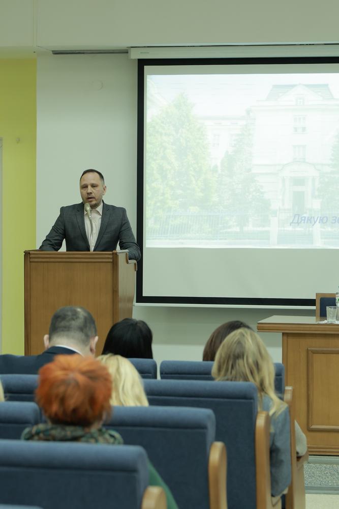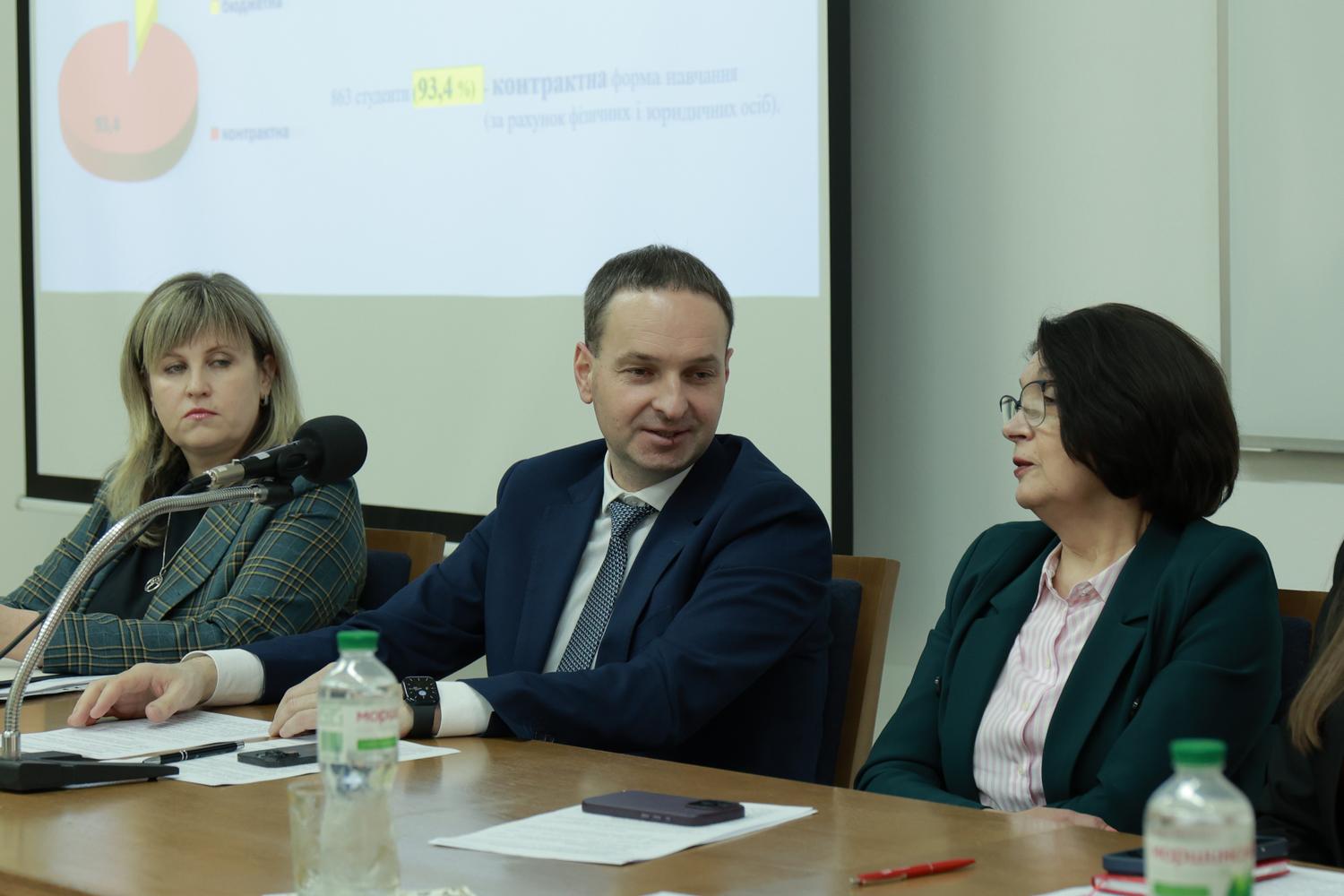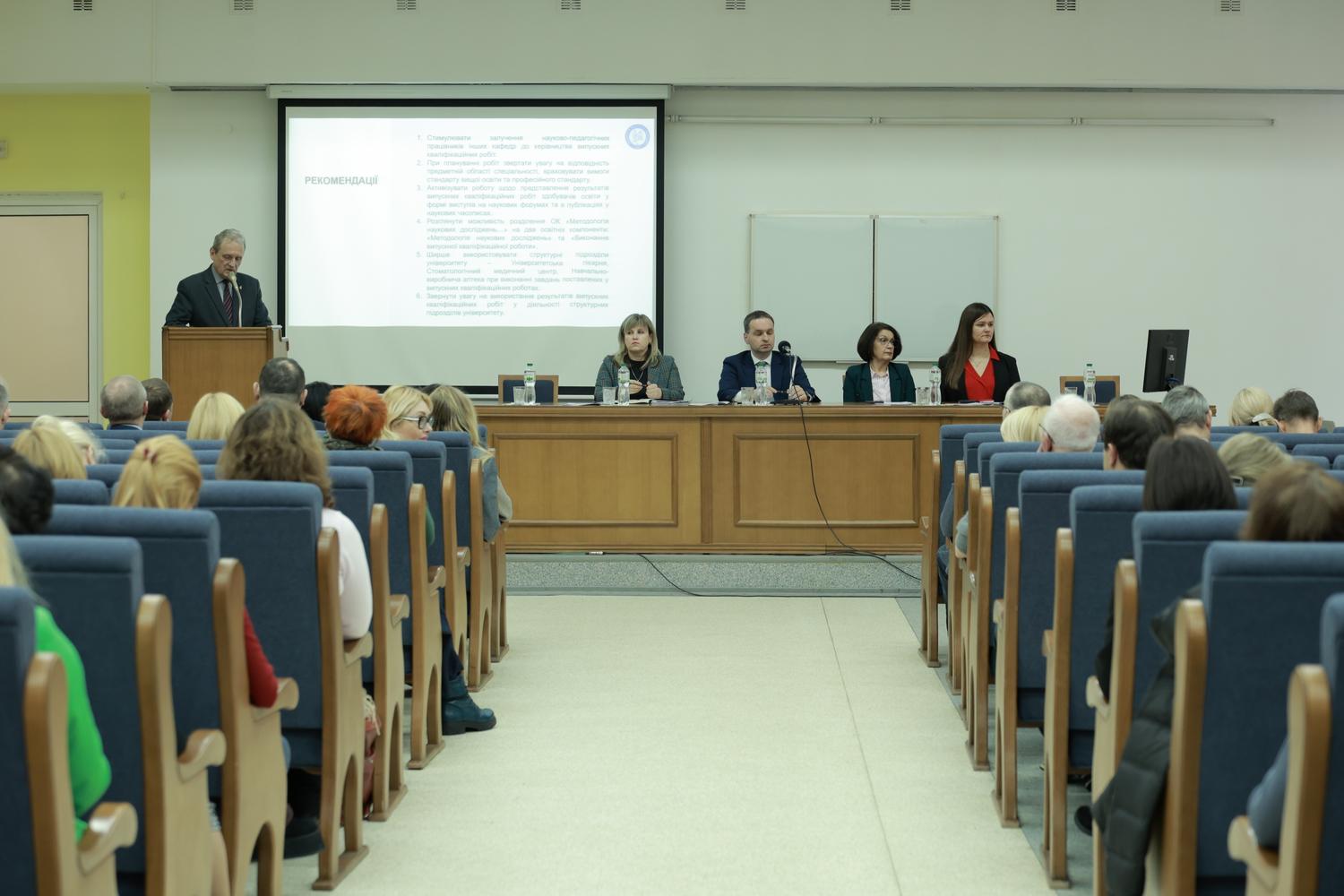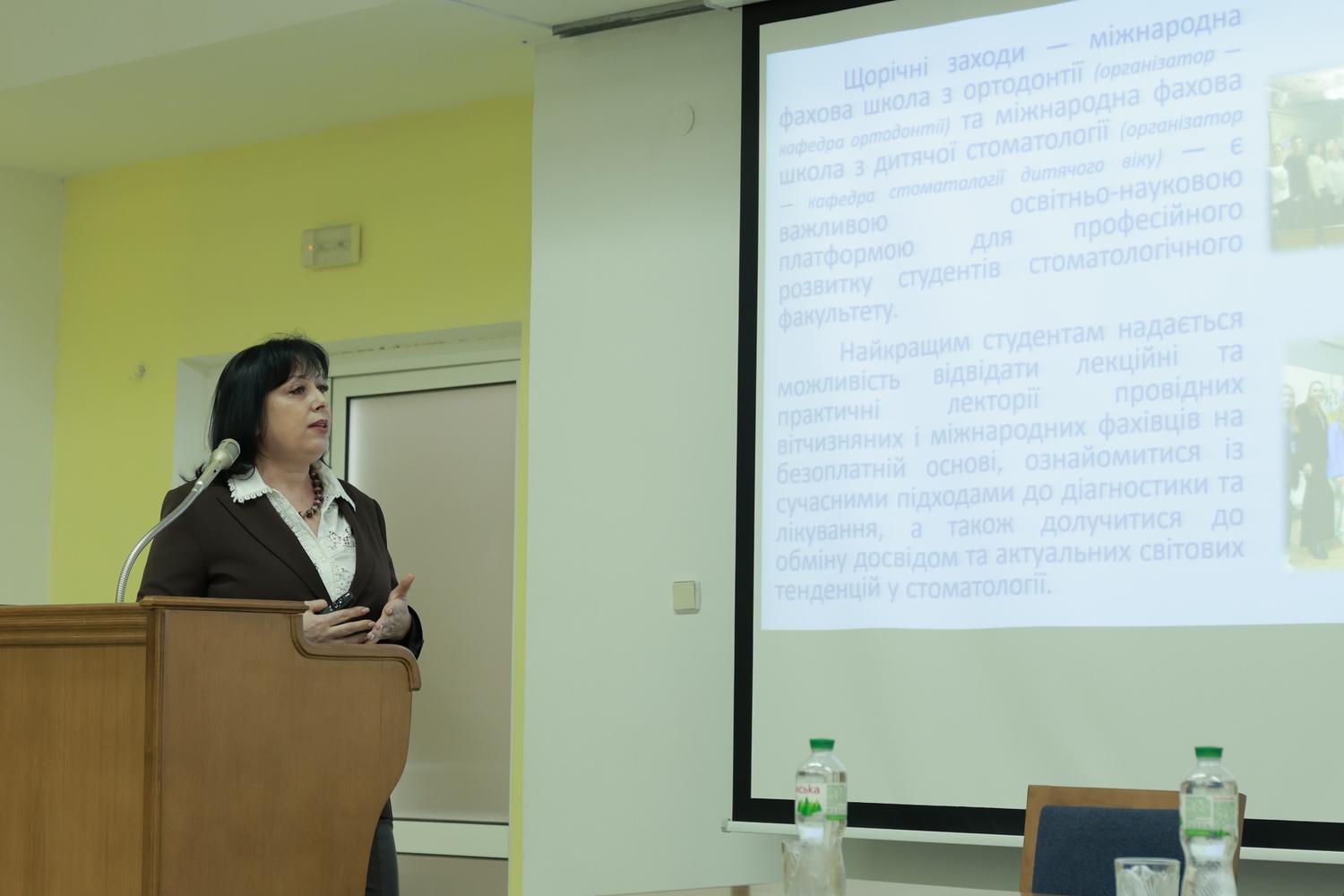 Далі присутні почули про результати внутрішнього моніторингу якості освіти, навчально-методичної, наукової і виховної роботи та кадрового забезпечення стоматологічного факультету. Доповідали про це деканка факультету, професорка Наталія Чухрай та голова моніторингової комісії, доцент Данило Камінський.