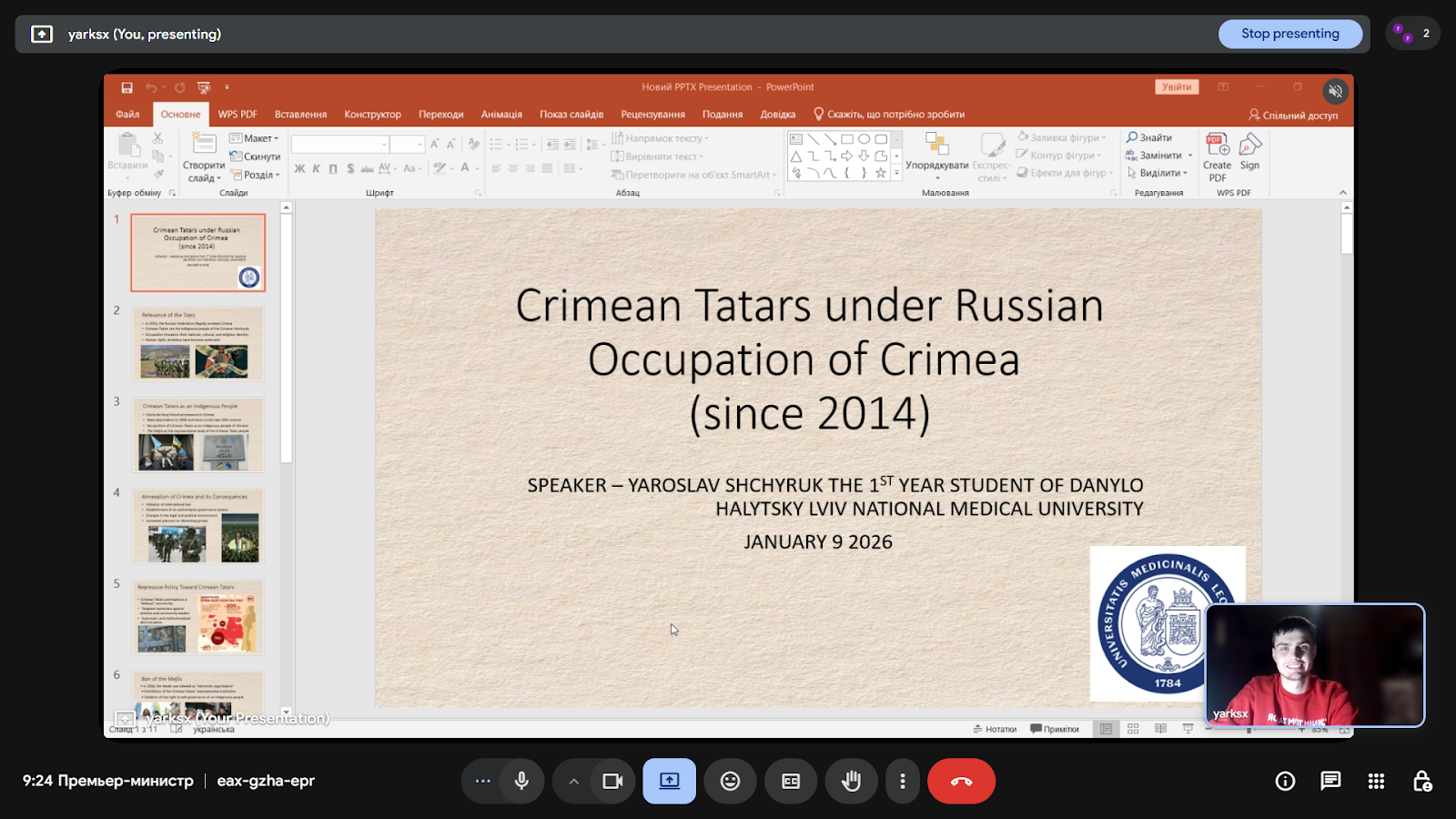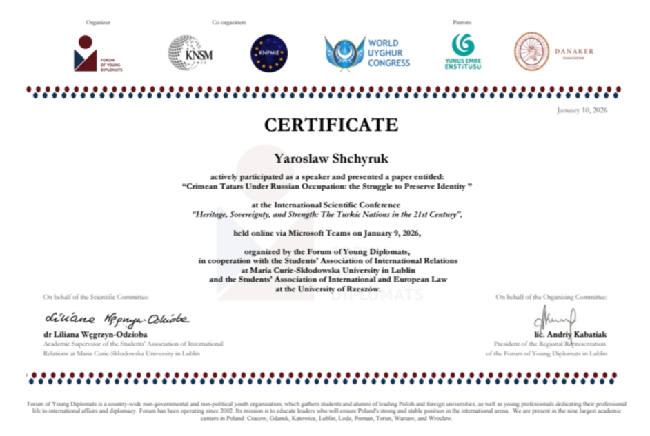 Під науковим керівництвом доцентки кафедри українознавства та філософії Наталії Гірної наш студент підготував дослідження про спротив кримських татар російської окупації півострова. Доповідь Ярослава Щирука «Кримські татари під російською окупацією: боротьба за збереження ідентичності»/ «Crimean Tatars Under Russian Occupation: the Struggle to Preserve Identity» була відібрана до участі в результаті конкурсу з-поміж понад сотні зареєстрованих. Організаційний комітет відзначив актуальність обраної теми, глибину дослідження, а також високий рівень володіння англійською мовою доповідача. Відтак, Ярослав Щирук отримав запрошення представити свою роботу серед студентів і молодих учених із різних країн.
