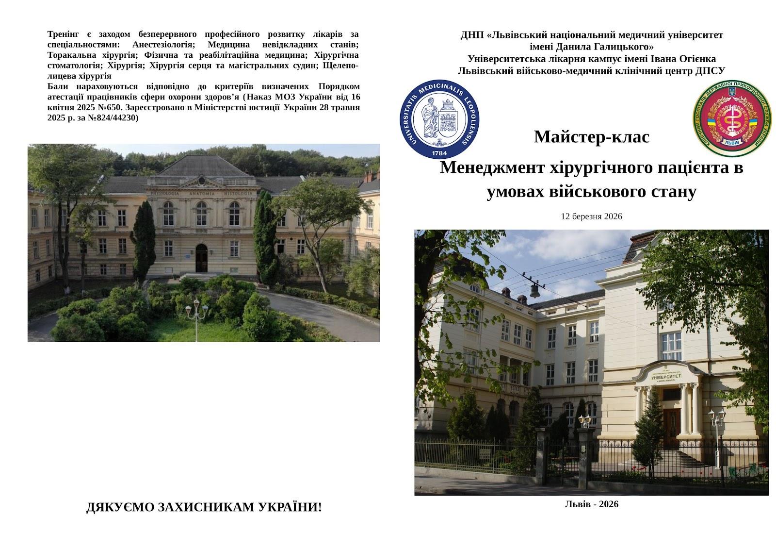 Кафедра загальної хірургії ЛНМУ ім. Данила Галицького спільно з Львівським військово-медичним клінічним центром ДПСУ та Університетською лікарнею проведуть майстер-клас з оволодінням знаннями та навичками “Менеджмент хірургічного пацієнта в умовах військового стану”.