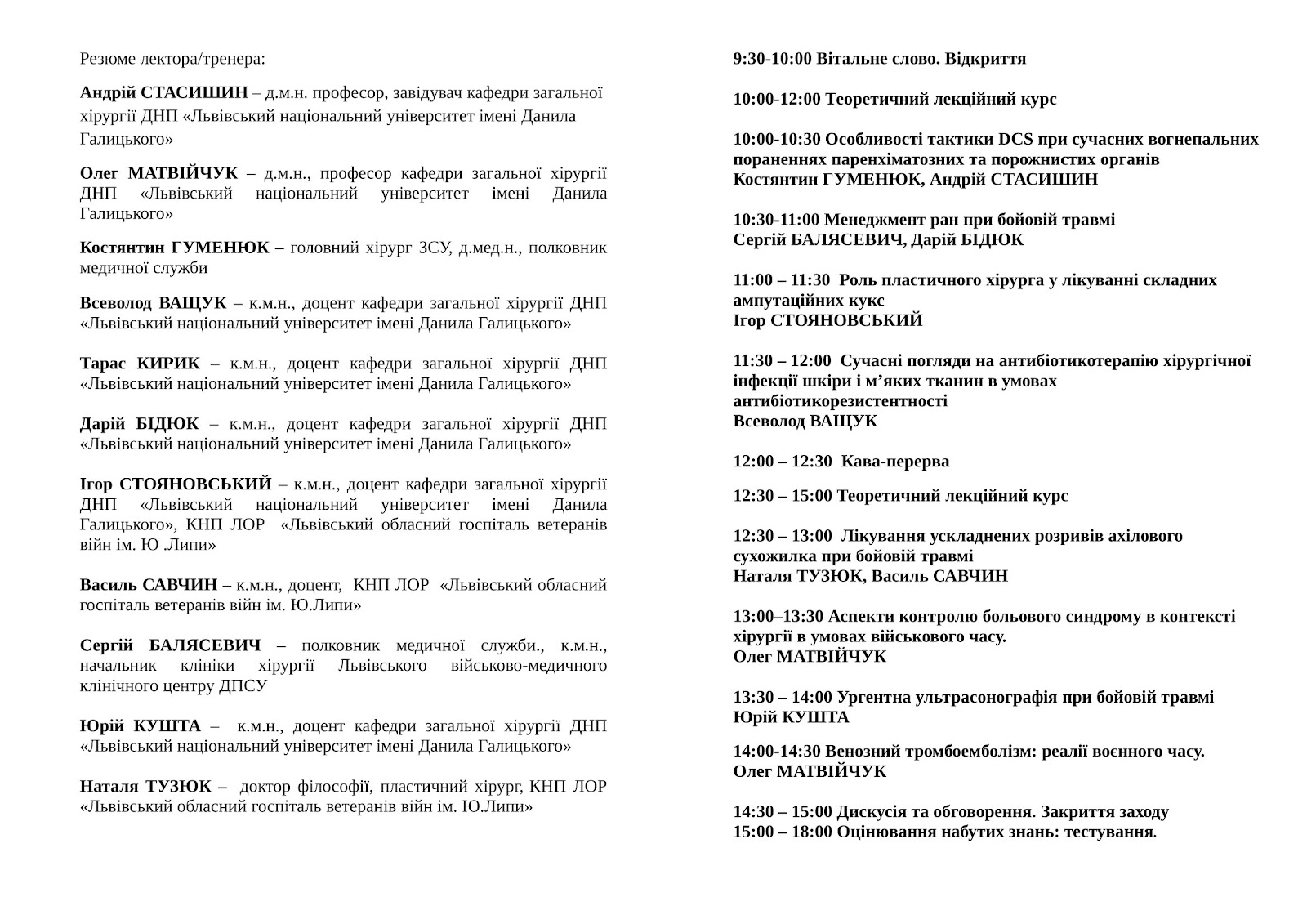 Спікери: викладачі кафедри загальної хірургії – практикуючі хірурги – професори Андрій Стасишин, Олег Матвійчук; доценти Всеволод Ващук, Ігор Стояновський, Василь Савчин, Юрій Кушта, Тарас Кирик, Дарій Бідюк, Наталя Тузюк. Своїм досвідом поділяться також головний хірург ЗСУ, полковник медичної служби Костянтин Гуменюк та начальник клініки хірургії Львівського військово-медичного клінічного центру ДПСУ Сергій Балясевич.