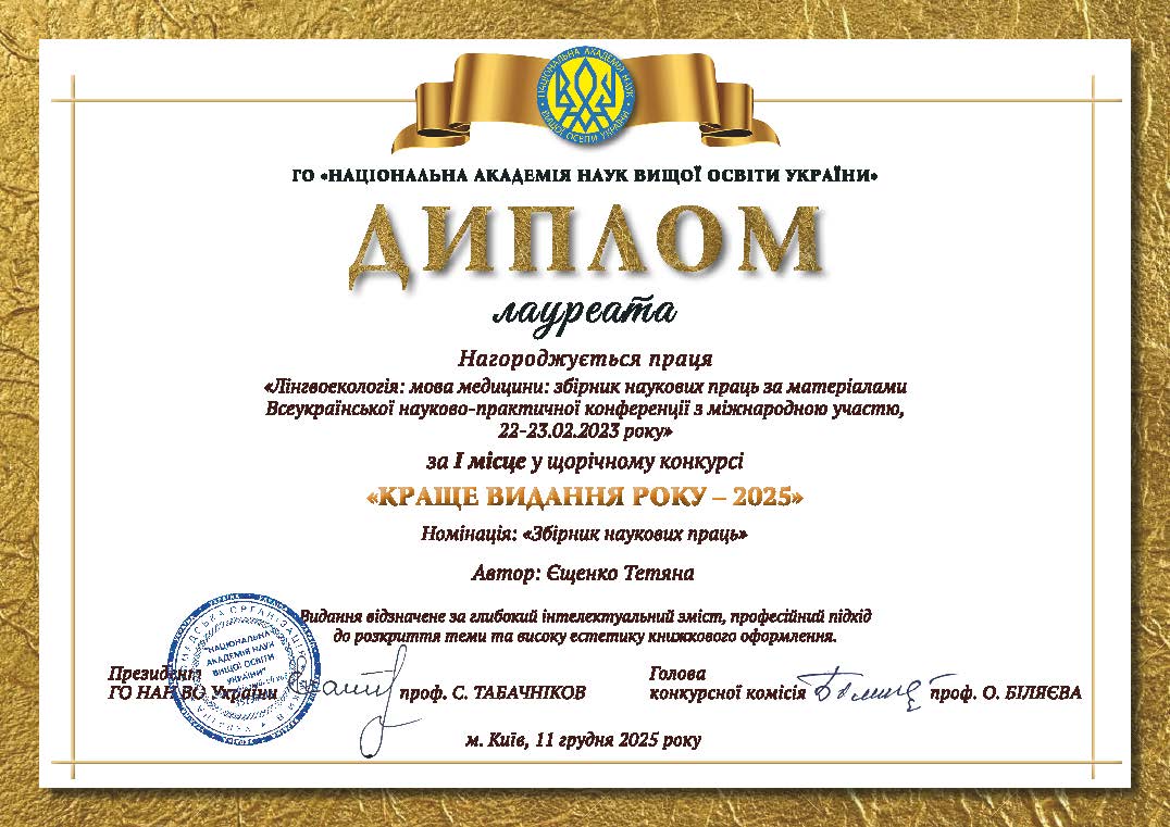 У номінації «Збірник наукових праць» перше місце та диплом лауреата отримала розвідка «Лінгвоекологія: мова медицини»: збірник наукових праць за матеріалами всеукраїнської наукової конференції з міжнародною участю 22-23 лютого 2023 року на пошану 150-річчя від дня заснування НТШ. Львів: Друкарня Львівського національного медичного університету імені Данила Галицького (наукова редакторка – професорка кафедри українознавства та філософії Тетяна Єщенко).