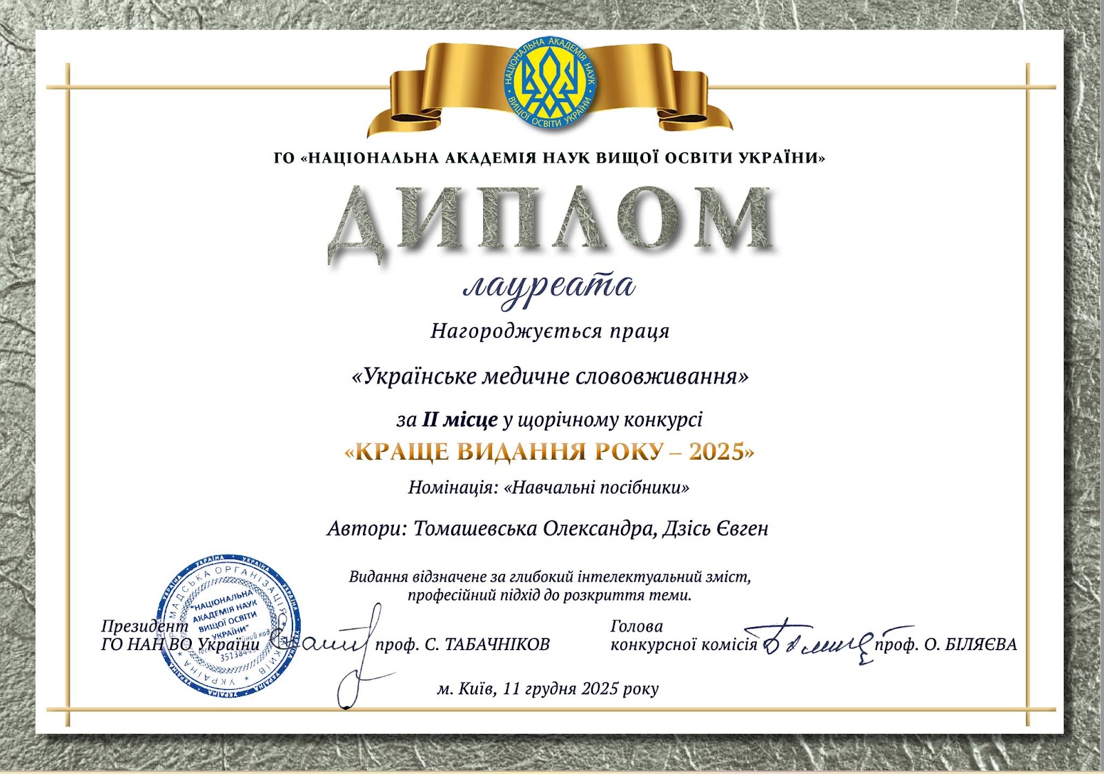 Ще двоє наших викладачів – професори кафедри внутрішньої медицини №2 – Олександра Томашевська та Євген Дзісь долучилися до створення посібника «Українське медичне слововживання», який вийшов у видавництві «Львівська політехніка» та отримав 2 місце у номінації «Навчальний посібник».