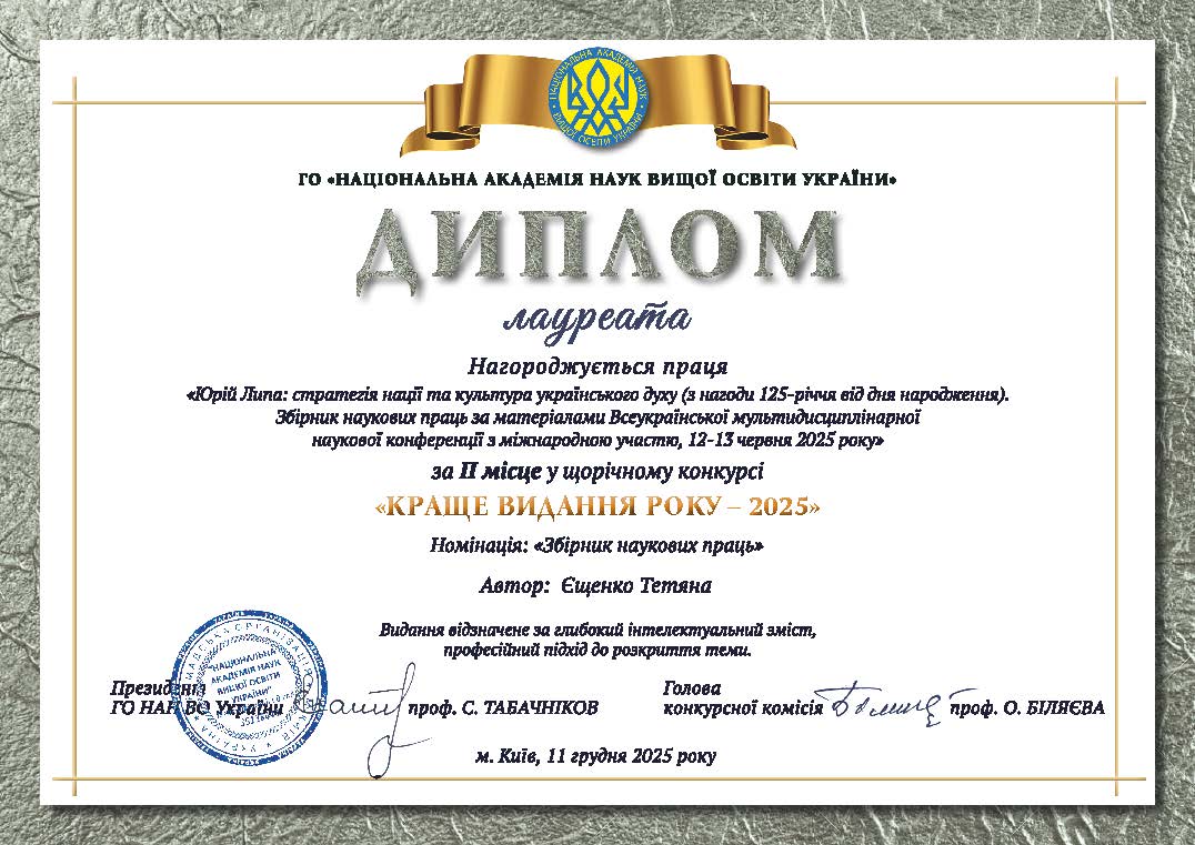 У цій же номінації дипломом за 2-ге місце відзначено працю «Юрій Липа: стратегія нації та культура українського духу (з нагоди 125-річчя від дня народження)»: збірник наукових праць за матеріалами всеукраїнської наукової конференції з міжнародною участю 12-13 червня 2025 року (наукова редакторка професорка кафедри українознавства та філософії Тетяна Єщенко).